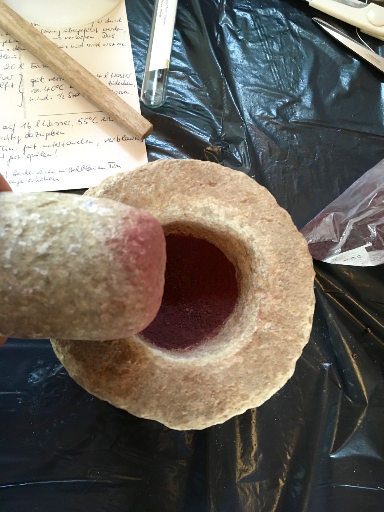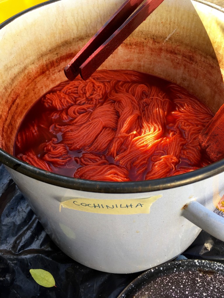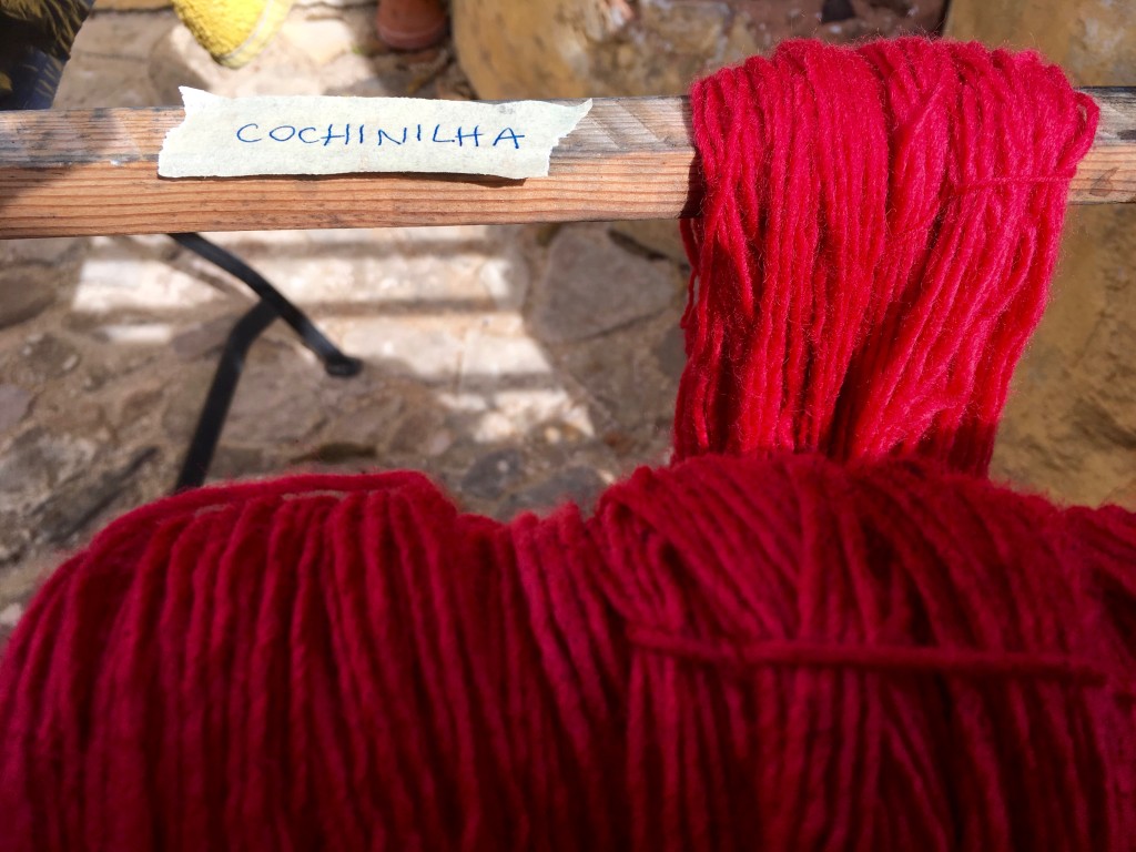 Ainda sobre o processo de tinturaria: experimentámos o vermelho nas fibras animais e desta vez o pigmento saiu de um inseto seco, mas muito nutrido de carmim. Gosto destas pragas e do efeito que provocam numa meada de lã. Ainda sobre este capítulo TINTURARIA, registo o trabalho feito pela Alice Bernardo, que sigo pelo Saber Fazer, uma fonte de pesquisa, resultados de experiências e imagens que mostro nas minhas aulas.